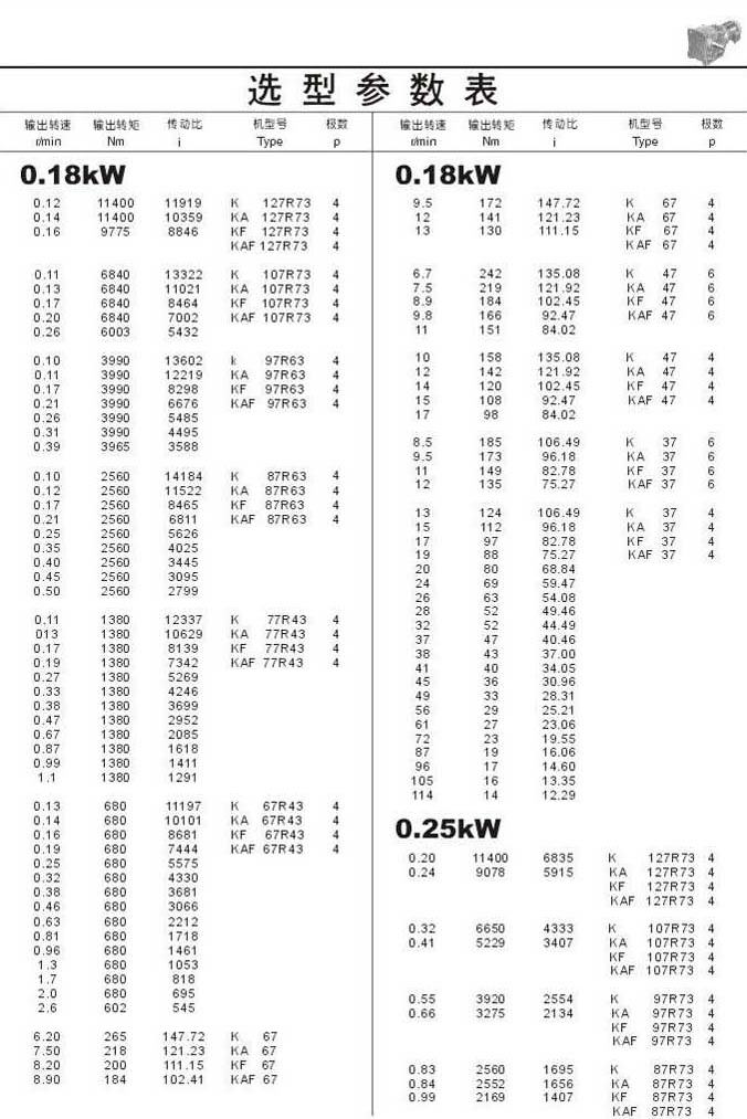 选型参数表0.18kW和0.25kW