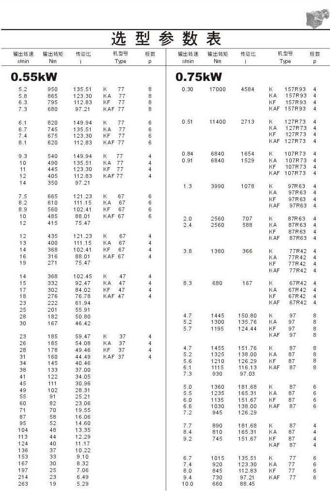 选型参数表0.55kW(续)和0.75kW