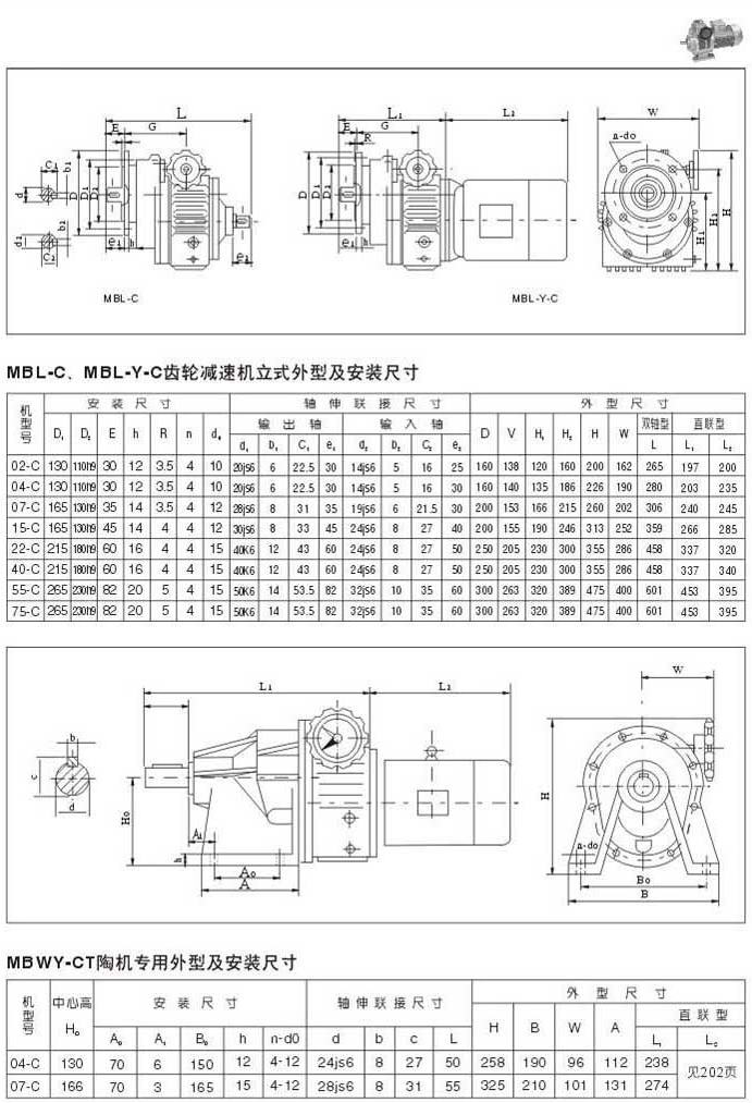 MBL-C,MBL-Y=C齿轮减速机的卧式外型及安装尺寸MBWY-CT陶机专用外型及安装尺寸