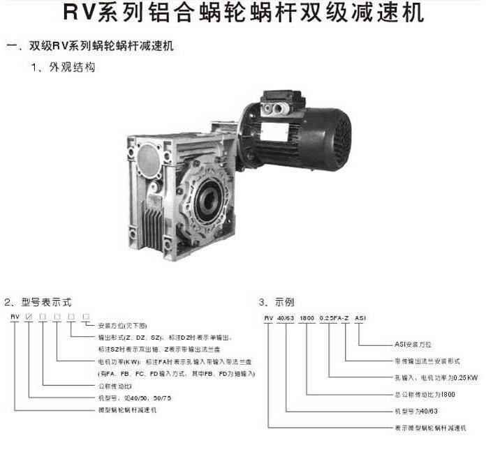 RV系列铝合金蜗轮蜗杆双级减速机双级RV系列铝合金蜗轮蜗杆减速机外观结构型号表示法