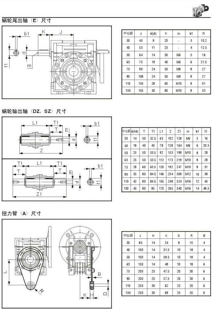 蜗轮尾出轴(E)尺寸蜗轮输出轴(DZ,SZ)扭力臂(A)尺寸