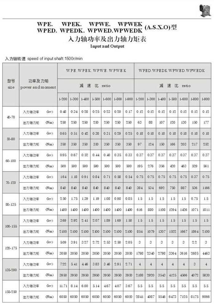 WPE,WPEK,WPWE,WPWEK,WPED,WPEDL,WPWED,WPWEDK(A,S,X,O)型入力轴功率及出力轴力矩表