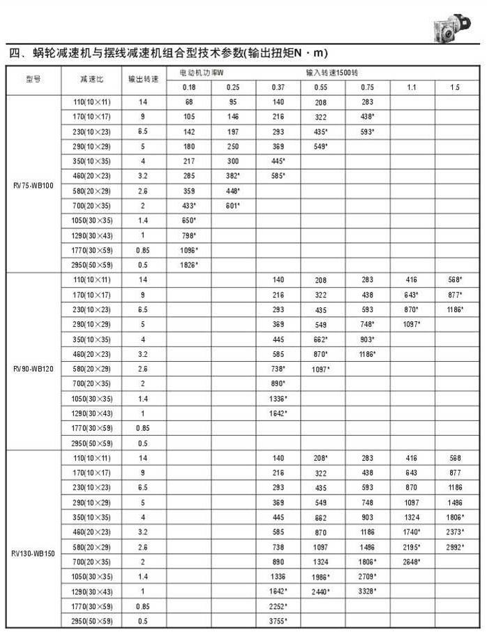 蜗轮减速机与摆线减速机组合型技术参数表(输出扭矩N.M)二
