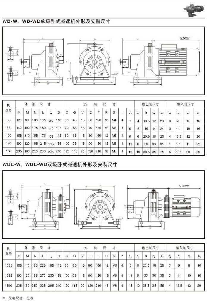 WB-W.WB-WD单级卧式减速机外型图,安装尺寸WBE-W . WEB-WD双级卧式减速机外型图,安装尺寸