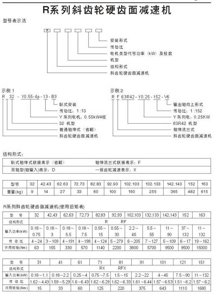 R系列斜齿轮硬齿面减速机型号表示法结构形式使用扭矩表